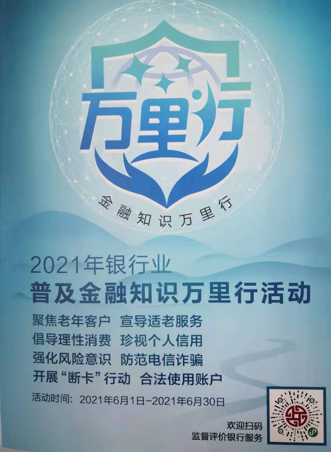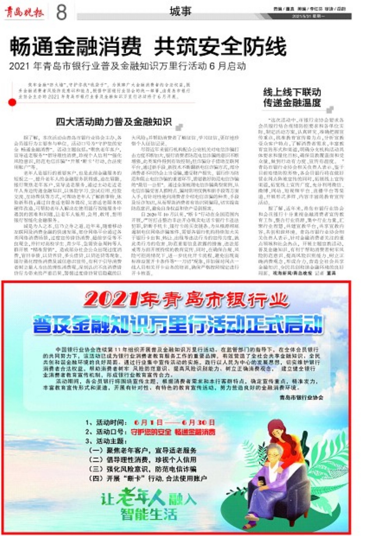 为深入贯彻习近平新时代中国特色社会主义思想,着力提升银行消费者风险防范意识和能力,切实履行消费者教育工作主体责任,全面保障广大金融消费者的合法权益,按照中国银行业协会的统一部署,青岛市银行业协会组织会员银行开展2021年青岛市银行业普及金融知识万里行活动。