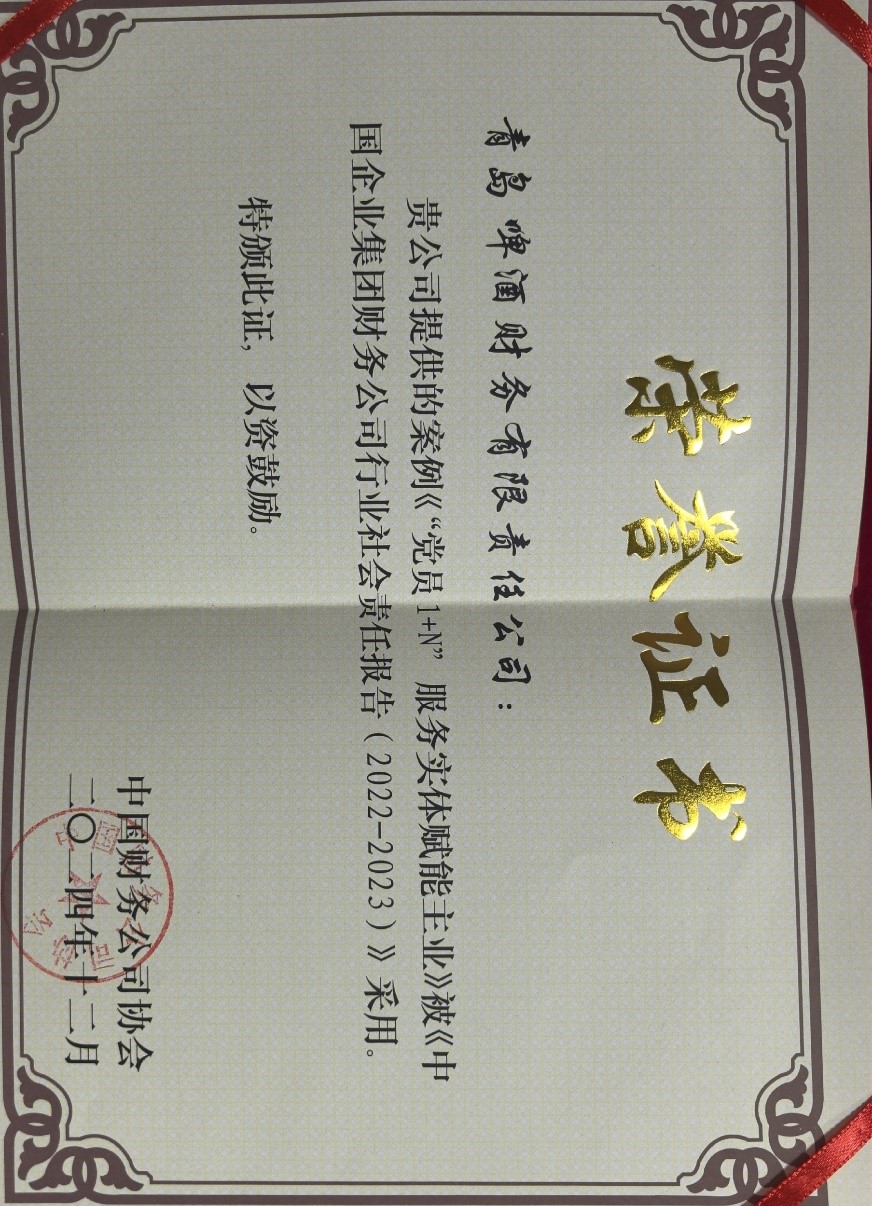 近日,在中国财务公司协会“2022-2023年度中国财务公司行业社会责任典型案例评选”活动中,青啤财务公司提报的《“党员1+N”服务实体赋能主业》案例被评为“治理类典型案例”,同时被《中国企业集团财务公司行业社会责任报告(2022-2023)》采用。这是对财务公司一直以来紧跟青啤集团步伐,运用“党员1+N”模式引导党员主动发挥先锋模范作用、坚持“金融服务实体经济”的最好鼓励和肯定。