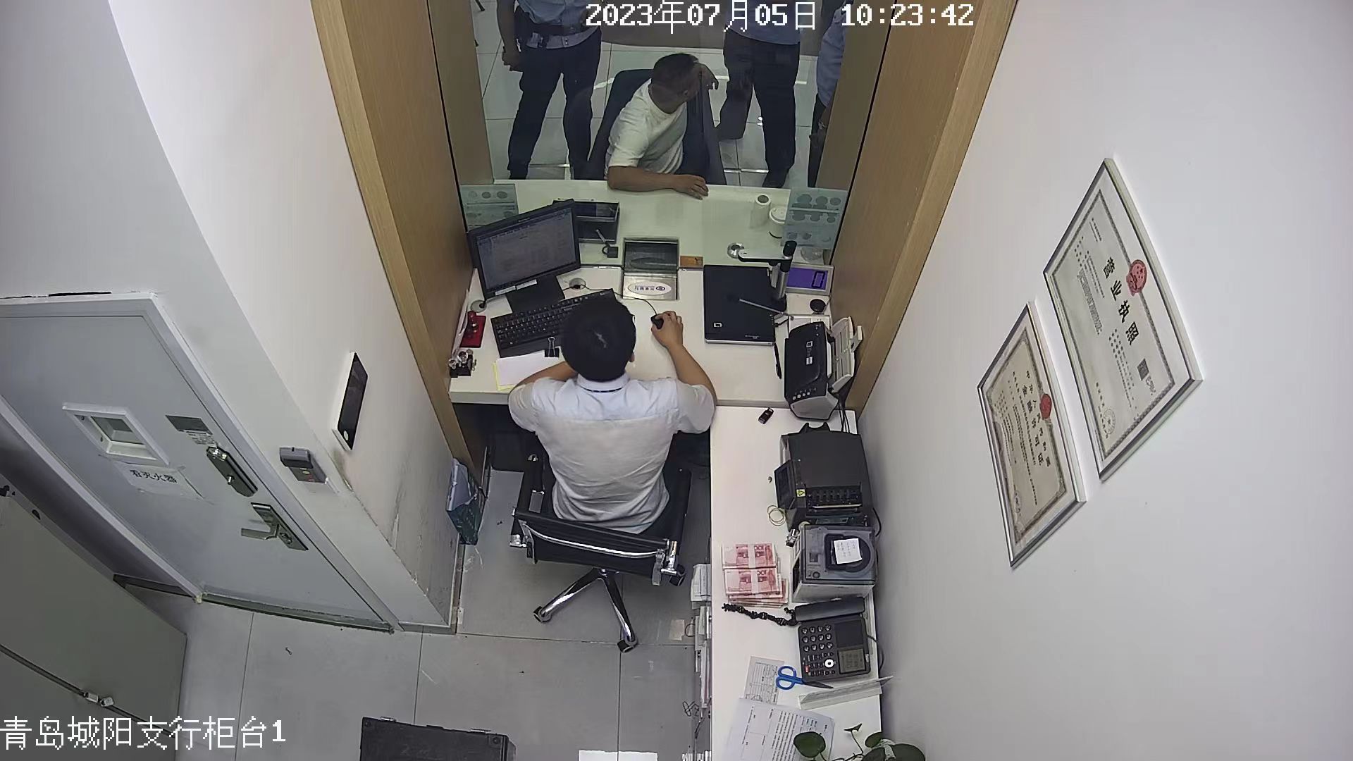 客户的种种反常的表现,让拥有多年工作经验、业务素质过硬的小陈判断此笔交易存在异常,并将情况迅速汇报给会计主管。主管了解情况后立即联系分行驻反诈中心同事,及时反馈可疑情况,青岛市反诈中心经研判后立即出警。在支行行长的安排部署下,城阳支行厅堂各岗位人员各司其职,在稳定该客户的同时安抚好厅堂其他客户的情绪。期间该客户多次想离开网点,均被厅堂人员稳住,直至警员到达将其控制带离。该客户由警员带离厅堂后不久,另有四名便衣警察到访,查看事发监控录像,获知客户至网点的停车地点后随即协同其他便衣警察直奔停车场,将车内留守的犯罪嫌疑人控制并带离。