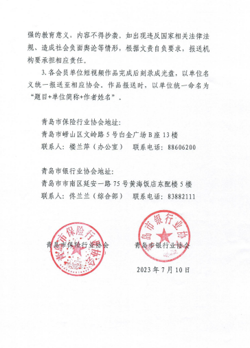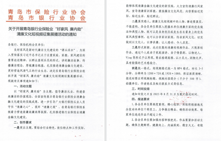 青岛市银行业协会、青岛市保险行业协会联合开展“好家风 廉内助”短视频征集活动