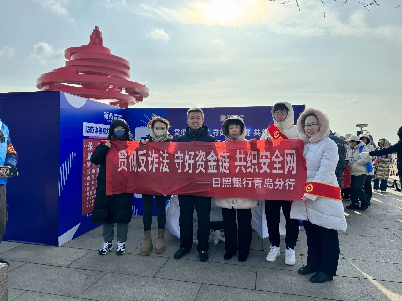 为进一步扩大反诈宣传的覆盖面和影响力,有效提高广大群众的防骗意识和识骗能力。2024年1月21日,日照银行青岛分行积极参加了由中国人民银行青岛市分行、青岛市公安局、共青团市委、青岛市广播电视台联合多家银行在五四广场举办的“贯彻反诈法 守好资金链 共织安全网”新春反诈志愿市集行活动。