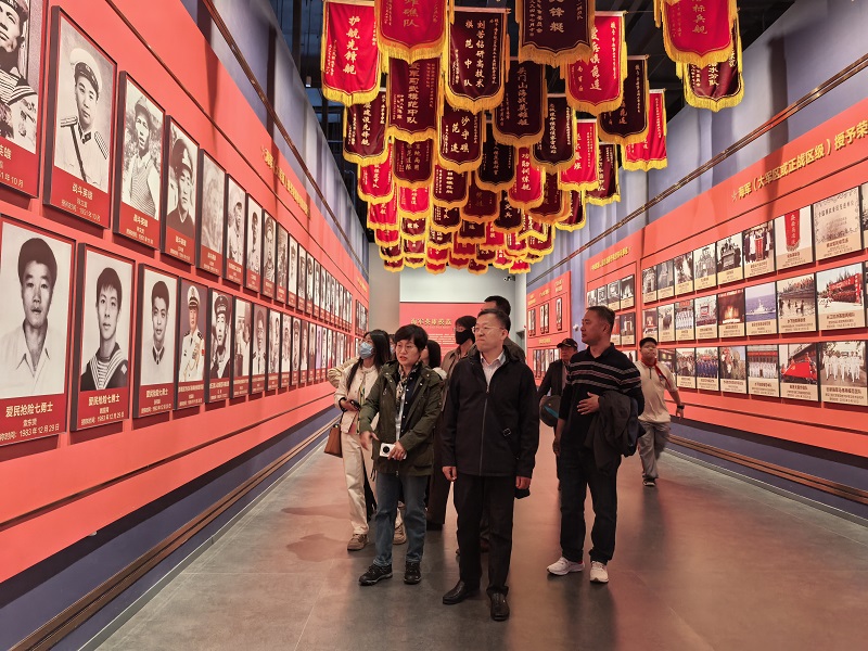 随后,大家来到海军授予荣誉称号的英模事迹展区。“海空卫士” 王伟为捍卫祖国领空,驾驶战机与美军侦察机英勇周旋,最终壮烈牺牲;“水下先锋” 张超为实现舰载机上舰的梦想,在训练中遭遇突发故障,为挽救战机壮烈殉国…… 一件件感人至深的事迹,通过图文、影像等形式生动呈现。在海军烈士纪念区域,全体人员神情庄重,缓步前行。讲解员深情讲述着烈士们在海战中浴血奋战、为守护海疆不惜牺牲生命的英勇故事,不少参观者眼眶湿润。潜艇舰队退役转业的老党员吕志海驻足在一位牺牲时年仅23岁的烈士姓名铭牌前,轻声说道:“战士的使命就是用生命诠释忠诚与担当。他们用青春和热血捍卫了国家尊严,这份精神永远值得我们铭记和传承。”