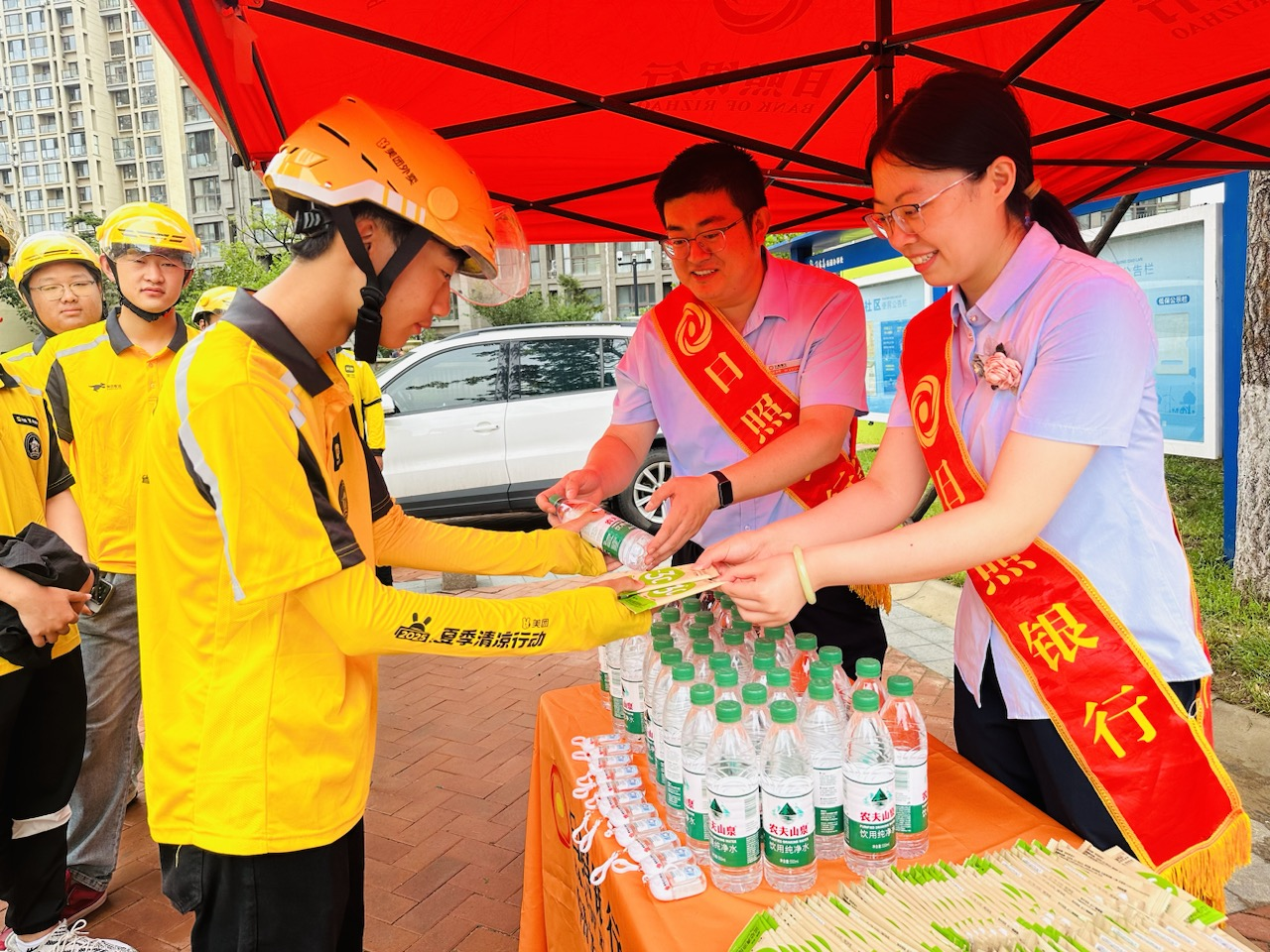 日照银行青岛开发区支行积极响应,同步行动,将服务新市民的初心融入实践,精心筹备清凉物资——消暑饮品、实用防晒装备等,并逐一送到骑手手中,用贴心物资为这群新市民“降温”,让他们在酷暑中感受关怀。工作人员还围绕新市民金融服务需求展开互动,从防范电信诈骗到合理规划储蓄,用通俗讲解守护骑手“钱袋子”,让金融服务真正贴近新市民群体,成为他们在城市奋斗的坚实后盾。