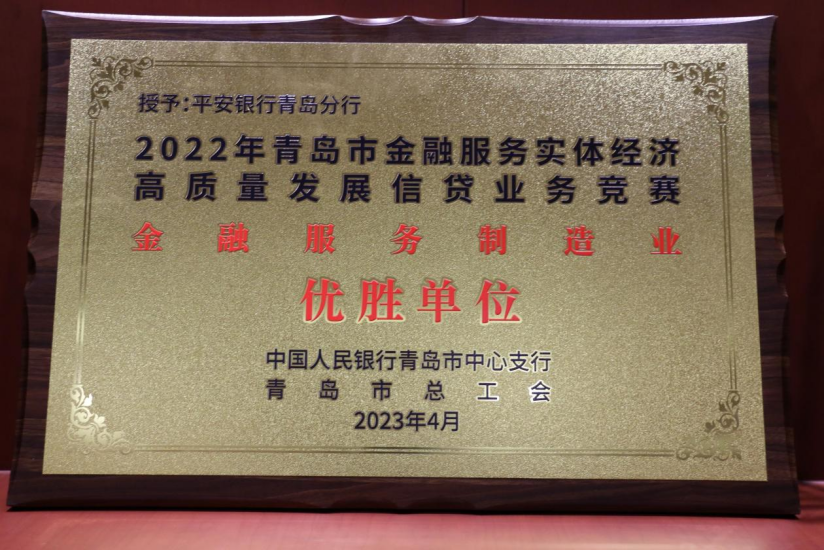 4月7日,在人民银行青岛市中心支行、青岛市总工会等部门联合开展的“服务实体经济 优化营商环境”2022 年青岛市金融服务实体经济高质量发展信贷业务竞赛颁奖暨2023年巩固提升年启动活动中,平安银行青岛分行荣获“金融服务制造业优胜单位”荣誉称号。