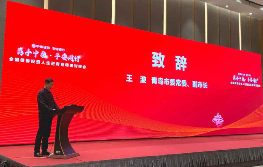 为搭建国有企业与机构投资人交流对接平台,提振投资人信心和预期,推动青岛市经济高质量发展,4月18日,青岛市举办了全国债券投资人走进青岛调研对接会,会议由平安银行与中泰证券联合主办,青岛市地方金融监管局、市国资委指导,上海证券交易所支持,邀请国内银行、保险、资管、信托、基金等130余家全国债券投资机构来青,与全市70余家国有企业面对面交流。青岛市委常委、副市长王波、上海证券交易所债券业务部副总监孙治山、平安银行首席资金执行官王伟、中泰证券党委副书记、监事会主席郭永利出席会议并讲话。一同出席的还有平安银行战略发展部董事总经理张杰、青岛分行行长李伟杰、团金会规划运营中心副总经理阎永婷、投资银行事业部总裁助理张盈啸、金融同业事业部营销总监华一等相关领导。