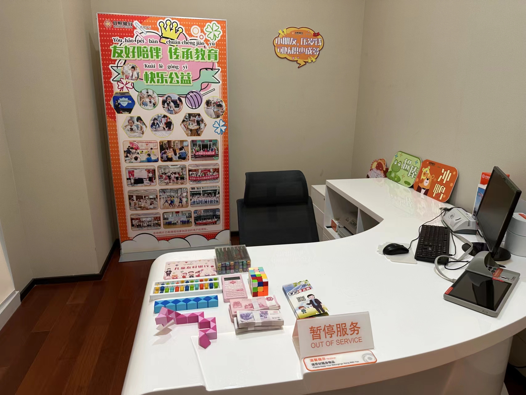 一米高度看金融。一是优化服务环境。充分尊重儿童特性,进行适儿化改造,融入儿童元素,设立儿童亲子陪伴区、儿童金融体验区和母婴室等服务专区。儿童亲子陪伴区配有大量儿童读本、书籍名著和儿童玩具,免费供市民享受亲子时光,儿童金融体验区设有儿童授课教学和职业体验教具,能够为儿童提供金融教育课程。二是创新财商教育。积极开展财商教育活动,自主研发“人民币的奥秘”“我是小小银行家”等课程体系,建立儿童理财室,模拟柜面配备点钞机、密码器等设备,为儿童提供职业体验场所;配置儿童桌椅、人民币样币、古钱币和儿童版行服等道具,以打卡、闯关的游戏形式提升儿童兴趣、激发参与度;创新“童眼看金融”,从儿童的视角,以卡通的形式制作漫画图文、漫画视频,通过微信公众号、视频号进行发布,提高儿童群体接受教育度。三是优化活动形式。开展“小小银行家”系列活动,并以传统节日为主题,先后开展“春节由来”“童心向党,红色教育从娃娃抓起”等活动,弘扬敬老、爱国等中华优秀传统文化。四是凝聚友好力量。日照银行青岛分行联合城运控股有限公司搭建合作平台,启动“一路‘童’行,金融知识进校车”活动,在校车行驶途中,为儿童播放有趣易懂的金融普教动画片,工作人员在现场教授识别假币等金融小知识。青岛分行成功荣获青岛市金融行业首家全国研学旅行实践基地授权。