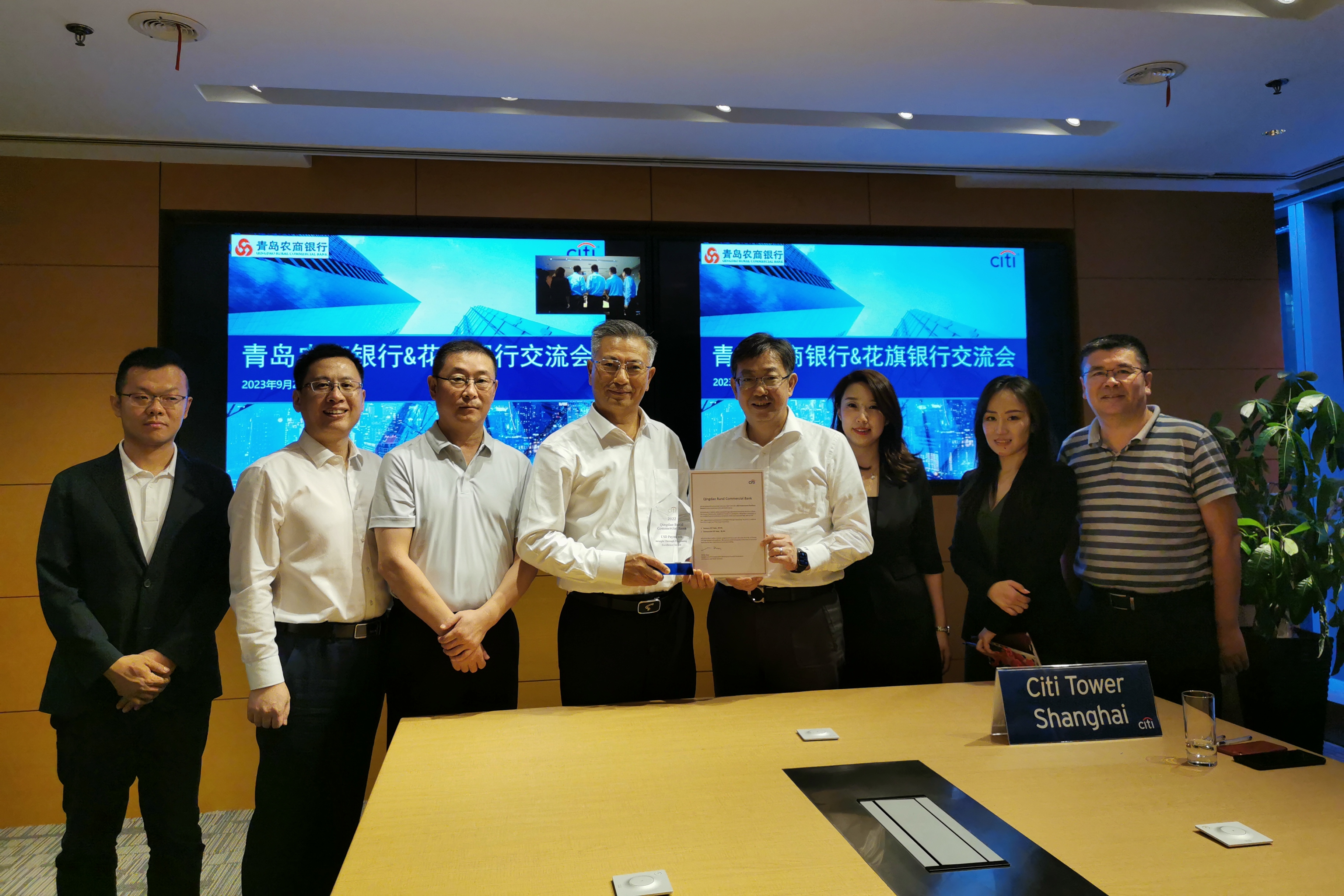国庆节前夕,上海传来喜讯。青岛农商银行以商业汇款98.3%、银行间汇款99.9%的美元清算直通率获得“2022年度花旗银行美元清算直通率(STP)卓越奖”,这是青岛农商银行连续第十次荣膺该奖项。花旗银行(中国)有限公司副行长杨长浩及相关部门负责人在花旗中国总部为青岛农商银行颁发奖项。青岛农商银行副行长丁明来、侯海滨同志及总行交易银行部、金融市场中心相关人员参加了颁奖仪式。